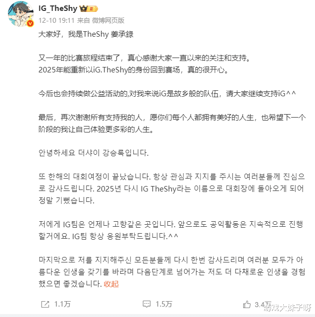 更重要的,是他的态度,TheShy近段时间的发文,几乎没有任何“为复出做铺垫”的意味,反而更像是对一段职业生涯的总结,他提到的是感谢、回忆和释然,而不是训练、目标或不甘,这种语气,对老观众来说其实并不陌生——很多传奇选手在真正告别前,都会经历这样一个阶段。