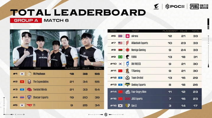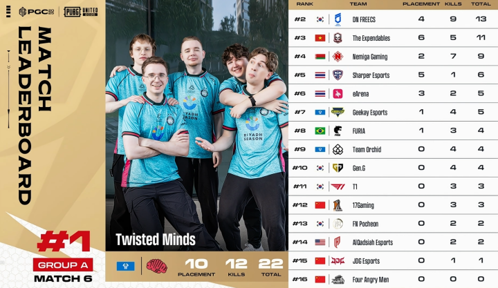 第6场比赛给了个机场圈,JDG很早就被淘汰出局,Y城的4AM又和T1泡在蓝圈里,阶段3蓝圈收缩,4AM被提前到桥头败阵的T1堵住,并且自己也在慌乱中翻车,真是神人了。阶段4圈形右切,凹坑里的17也不太好过,被FN和NMG包在中间只能强行去换分,77最后还是被NMG收掉,同时阶段5圈形刷新,T1全队也倒在了蓝圈里。