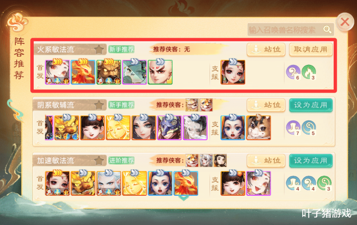 新手阵容推荐的话,叶子猪建议前期采用泥石怪+金刚仙+喷火牛低费召唤兽过渡,中期替换成雨师+五叶+凤凰。