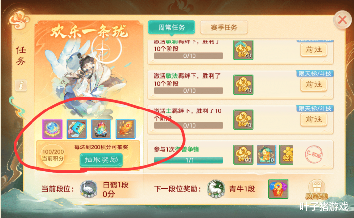 完成周常任务、赛季任务可以获得任务积分,只限制天梯/斗技赛可以获得,达到200积分之后可以进行“欢乐一条珑”抽奖,有概率获得聚魄丹、见闻录等奖励。