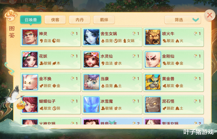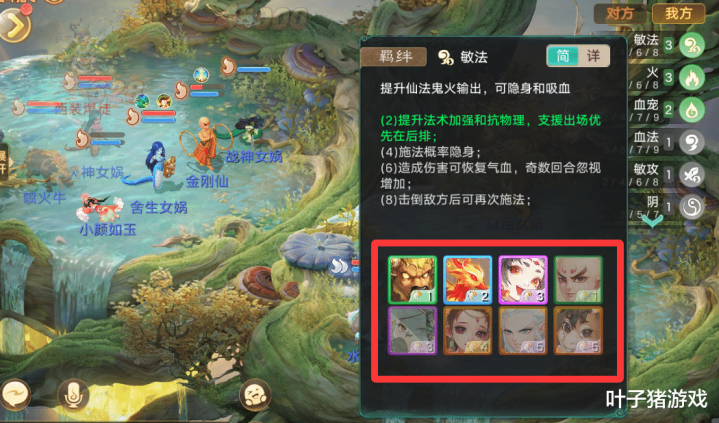 后期可以凑成这套火系敏法流,需要的召唤兽比较少。凑成“6敏法+3火”羁绊,最终成型阵容是:小颜如玉+凤凰+喷火牛+雨师+金刚仙,支援宝宝用颜如玉即可。